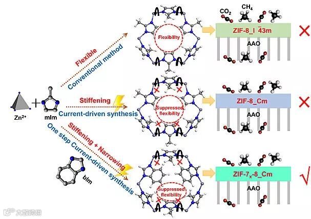 图1. 实验设计思路图:传统法制备柔性ZIF-8膜、电驱动制备刚性ZIF-8膜和电驱动法一步合成混合配体ZIF-7x-8膜概念图及这三类膜对CO2/CH4分离性能对比图。
