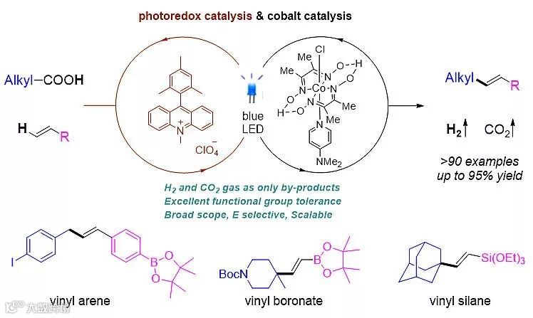 新加坡国立大学化学系的吴杰教授课题组最近实现了光驱动的无需外加氧化剂的烷基羧酸和烯烃的脱羧Heck偶联反应(图2)。在光氧化还原催化和钴催化的协同作用下,多种烷基羧酸和烯烃都可以被高效脱羧偶联(超过90个例子,代表性产物见图3)。反应不需要外加氧化剂,副产物只有氢气和二氧化碳两种气体。此外,产物顺反选择性高、官能团兼容性好、无需贵金属,并且可以放大到克级规模。值得一提的是,在该催化体系下,烯基硼酸酯和烯基硅烷也可以参与反应,这是第一例烷基合成子与烯基硼酸酯或烯基硅烷进行Heck偶联反应的报道。而且,带有三级烷基取代基的烯基硼酸酯和烯基硅烷很难通过别的方法高效简洁合成,例如烯烃复分解反应中由于位阻效应这类底物很难参与反应。