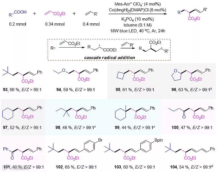 在机理研究的基础上,作者进一步发展了烷基羧酸、丙烯酸酯和烯烃的三组分偶联反应(图5)。多种羧酸和烯烃都能参与反应,选择性生成高度官能化的烯烃。