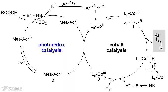 图2. 光驱动的无需外加氧化剂的脱羧Heck偶联反应。图片来源:J. Am. Chem. Soc.