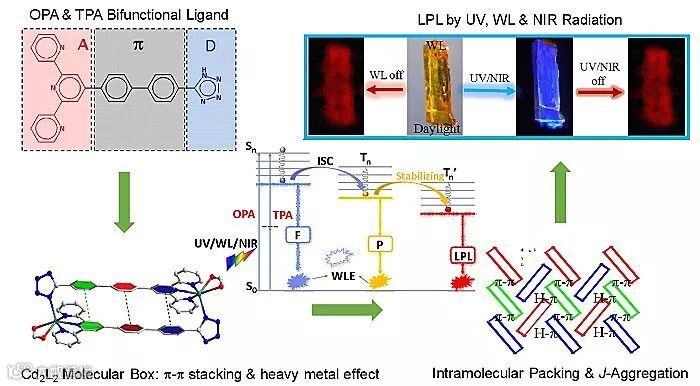 中山大学潘梅教授课题组另辟蹊径,设计了一种基于D-π-A型配体的金属-有机超分子盒。配体的电子结构赋予其同时具有良好的单光子吸收(OPA)和双光子吸收(TPA)的双路径发光特性。在配体与Cd(II)组装构筑的M2L2超分子盒中,配体的双路径发光得以保持,并通过金属中心的重原子效应,以及超分子组装中的π堆积和J聚集态得以强化、放大和优化。在该配位超分子盒材料中,不仅可以利用紫外(UV)或可见白光(WL)激发的OPA路径,同时可以有效利用低能近红外光(NIR)激发的TPA路径,经由不同激发单重态到三重态之间的能量转移过程,实现了蓝色荧光(F)、黄色磷光(P)、组合白光(WLE)、以及红色长余辉发光(LPL)的丰富发光现象。由此,在金属-有机材料中,首次获得了同时具有紫外、可见白光和近红外光的广谱光能蓄水池,并由此触发红色长余辉的多功能发光材料,可广泛应用于隐身、防伪、装饰、显示等不同领域。