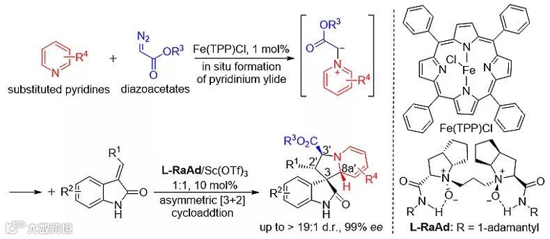 冯小明院士团队利用其自身发展的特色手性双氮氧钪配合物催化剂与非手性的铁催化剂接力催化的策略,实现了吡啶叶立德参与的不对称[3+2]环加成反应,得到一系列手性的四环氧化吲哚骨架结构,并通过机理研究对该反应有了较为深入的认识。该工作得到国家自然科学基金委的资金支持,相关结果发表在Angew. Chem. Int. Ed. 上,论文的第一作者为四川大学的博士研究生张东。