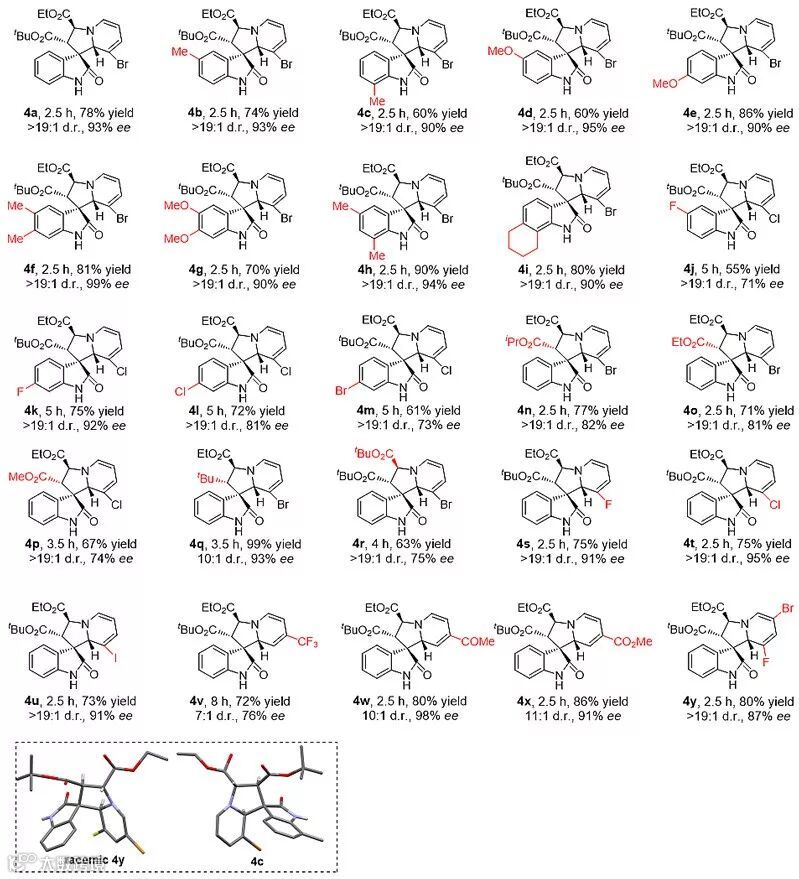首先,作者以3-烯基吲哚酮1a、α-重氮乙酸乙酯2a以及3-溴吡啶3a为模板底物进行条件的筛选,经过一系列的条件优化,最优条件确定为:1 mol%的Fe(TPP)Cl作为非手性催化剂、10 mol%的L-RaAd/Sc(OTf)3配合物作为手性催化剂、MeOAc作为溶剂,反应在0 ℃下进行2.5 h,以78%的收率、>19:1的非对映选择性、93%的对映选择性得到目标产物4a(图三,entry 9)。