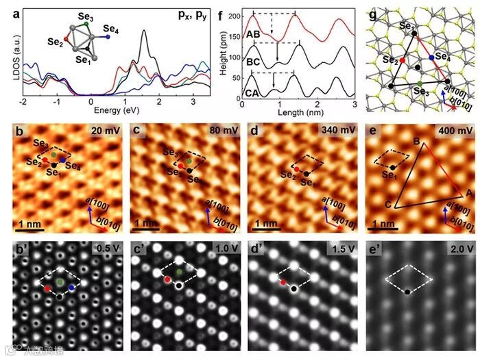 图2. Au箔上单层ReSe2偏压依赖的STM成像及理论模拟结果。(a)ReSe2的一个元胞中4个不等价Se原子的4px和4py轨道的局域电子态密度(LDOS)的计算结果;(b-e)Au箔上单层ReSe2在不同偏压下的STM形貌图;(b'-e')不同偏压下的STM模拟成像;(f)在(e)图中沿A-B-C三个方向的表面高度分析图;(g)与(e)图对应ReSe2的结构示意图。
