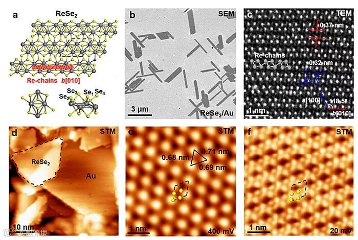 图1. ReSe2各向异性的晶格结构。(a)ReSe2的晶格结构示意图;(b)Au箔上ReSe2平行四边形畴区的SEM成像;(c)高分辨STEM成像显示单层ReSe2各向异性的晶格结构;(d)Au箔上单层ReSe2的大尺度STM成像;(e-f)不同偏压下原子尺度的STM成像显示ReSe2的亚元胞级结构。