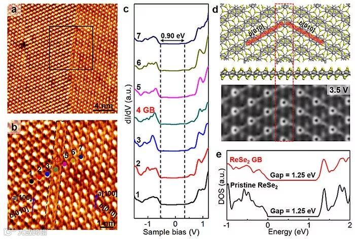图4. Au箔上单层ReSe2中镜像对称型畴区边界的原子结构及电子结构分析。(a-b)Au箔上单层ReSe2中镜像对称型畴区边界的STM成像;(c)在(b)图中标记位置所作的STS谱;(d-e)该畴区边界的结构及带隙的理论模拟结果。