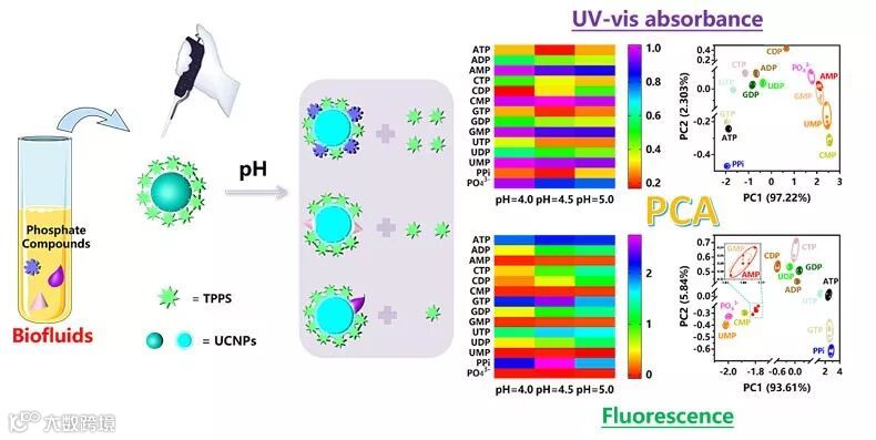 近日,华东师范大学的研究团队利用一种卟啉水合物(TPPS)和Ln-UCNPs组成有机/无机杂合体,通过pH(例如pH = 4、4.5和5)调节其光学性质(紫外可见吸收光及上转换荧光),开发了一种双模式光学传感器阵列(即TPPS/Ln-UCNPs4、TPPS/Ln-UCNPs4.5和TPPS/Ln-UCNPs5),实现了对生物体液中14种磷酸化合物的模式识别分析,为生物体液中磷酸化合物的大规模区分检测提供了一种全新高效的解决方案。结合主成分分析方法,基于模式识别的TPPS/Ln-UCNPsn传感器通过TPPS和磷酸化合物之间的差异化竞争相互作用可以成功地对磷酸化合物进行灵敏检测,并对不同浓度的磷酸化合物及其混合物进行区分。该传感器具有易操作、低成本和快速响应的分析性能,也成功地用于复杂生物样品中磷酸化合物的分析检测,可实现无创分析。