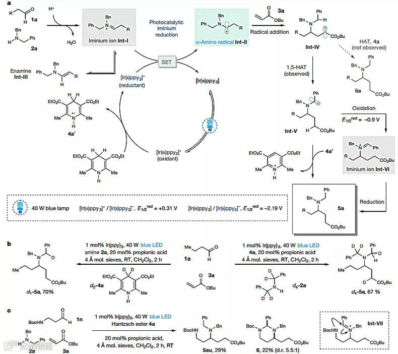 该反应氨基烷基化的机理如图3a所示。可见光激发Ir(ppy)3得到长寿命的激发态*Ir(III)物种,Hantzsch酯4a(Ir(III)/Ir(II),E1/2red=0.31 V)能有效地淬灭*Ir(III)ppy3,从而得到[Ir(II)ppy3]-和相应的Hantzsch酯自由基阳离子4a'。[Ir(II)ppy3]-能充分还原(Ir(III)/Ir(II),E1/2red =−2.19 V)烷基亚铵离子Int-I,得到α-氨基自由基Int-Ⅱ。α-氨基自由基Int-Ⅱ与极性匹配的丙烯酸酯3a反应,形成碳-碳键和α-酯自由基Int-IV。考虑到单取代α-酯自由基Int-IV易发生聚合,可通过苄位的分子内1,5-HAT对其进行动力学捕获,形成稳定的Int-V自由基。作者认为Hantzsch酯4a或其自由基阳离子4a'可参与Int-V的HAT反应,形成胺5a。作者还设计了氘标记的Hantzsch酯d2-4a(图4b)参与反应证实了氘完全结合在胺d1-5a的苄位,表明1,5-HAT发生在捕获4a或4a'之前。氘标记的二苄胺d4-2a进一步证实了其中一个氘原子转移到胺d4-5a中靠近酯的位置。作者还发现,含β-亲核基团(1n)的醛可在苄基发生环化形成6,这是形成5au的一个副反应(图4c),表明α-氨基苄基自由基(Int-V)可氧化(E1/2red=−0.9V)为Int-VI,也能通过*Ir(III)氧化得到。Int-VI的还原可以通过4a的双电子转移过程进行,也可以通过光催化SET和HAT进行。
