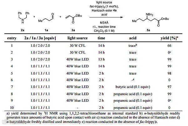 作者首先以丁醛1a、二苄基胺2a、丙烯酸丁酯3a作为模板底物,Hantzsch酯4a作为氢转移试剂,1 mol%的Ir(ppy)3 作为光催化剂,反应在室温、40 W蓝色LED灯的照射下以进行条件优化,最终得到最优条件:在含有分子筛和20 mol%丙酸的二氯甲烷溶液中,几近等当量的醛、胺和烯烃以及1.5当量的Hantzsch酯反应可形成所需的三级烷基胺类产物5a,分离产率为84%。该反应具有良好的选择性,只观察到微量的还原胺化副产物。