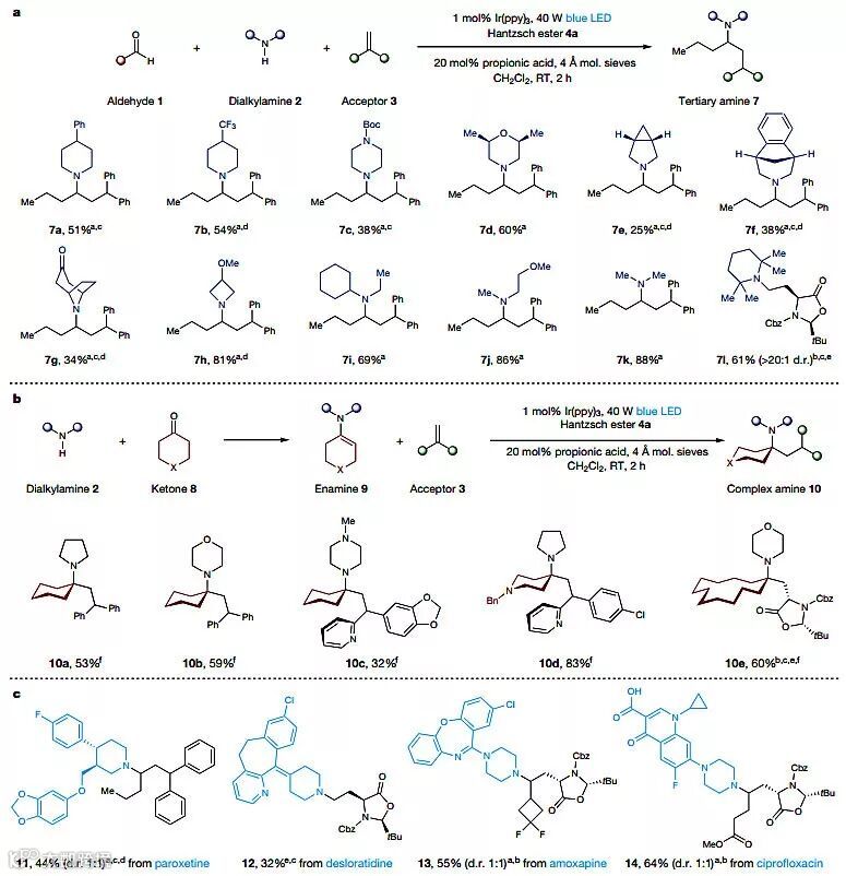 Matthew J. Gaunt教授课题组发展了一种操作简单、机理独特的催化过程,实现了二烷基胺、羰基化合物与烯烃的三组分光催化偶联,拓展了烯烃氢氨基烷基化反应的适用性,有效合成复杂多样的三级烷基胺产物。该反应条件温和,并能实现复杂药物分子的后期官能化。这种高选择性、多组分光催化合成胺的方法无论在学术界还是在工业界都有望得到广泛的应用。