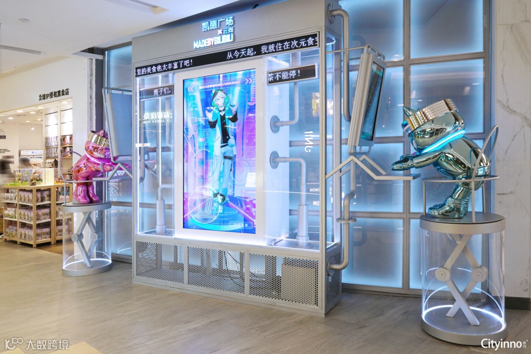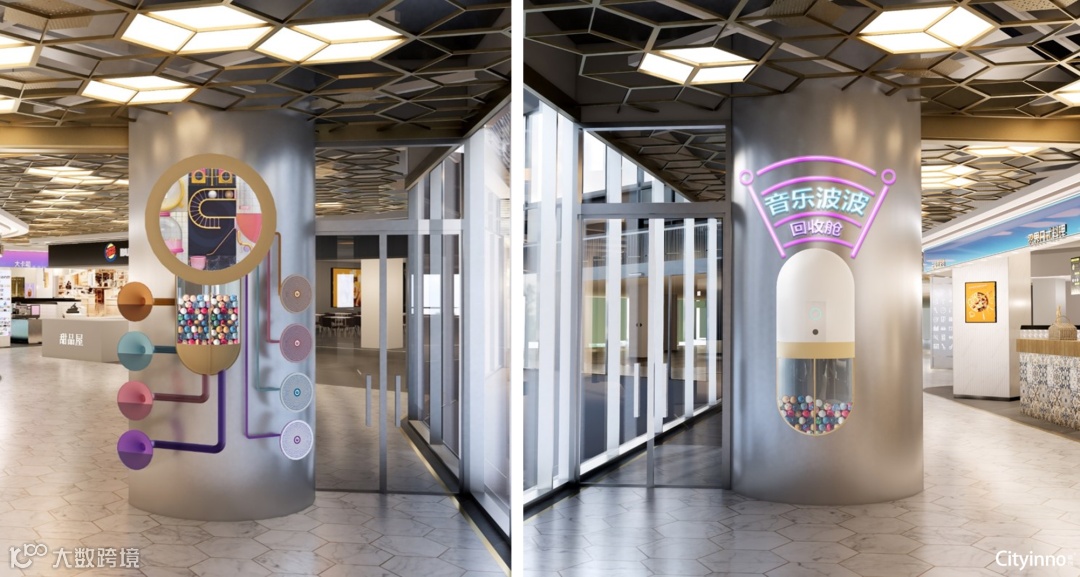 靠近落地玻璃的柱子运用盲盒装置巧妙地增加了边角区域的趣味性,制造更多让消费者驻足停留的机会,同时增加了与商户的联动。