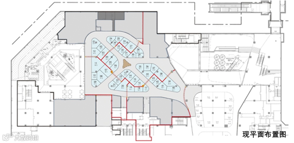 在改造过程中我们优化了布局,减弱了空间的切割感,并增加主次通道,沿动线规划更多商铺展示面,由单一通道改为四通道及环绕通道,增加空间视觉通透感。