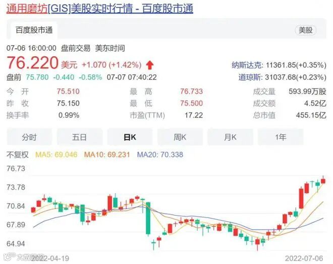 对此,通用磨坊中国回应称,前述两个批次产品均未在中国大陆销售。坐拥哈根达斯、湾仔码头、绿巨人等知名品牌,通用磨坊日前公布了截至5月29日止2022财年第四财季业绩,实现营业收入48.9亿美元,同比增长8%,净利润8.23亿美元,同比增长97%,超出市场预期。业绩向好,通用磨坊股价亦走势强劲,日前创下76.73美元/股的历史新高。