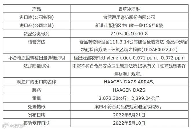 根据中国台湾食药署2022年6月21日发布的信息,本次被检出含有环氧乙烷的产品为哈根达斯香草冰淇淋,进口商为台湾通用磨坊股份有限公司,不合格原因为“检出残留农药ethylene oxide 0.071ppm、0.072ppm”(ethylene oxide即为环氧乙烷),处置情形为“案内不符合商品依规定退运或销毁”。