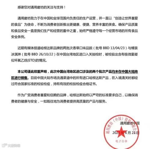 针对前述事件,哈根达斯方面曾明确本次检出环氧乙烷的两个批次产品分别为香草品脱冰淇淋(有效日期为2023年4月13日)、香草桶装冰淇淋(有效日期为2022年10月26日),并表示已在第一时间做了紧急处理,呼吁今年4月26日以后购买到相关批号的民众,可持购买证明至原通路退款,退款期限至今年8月31日。