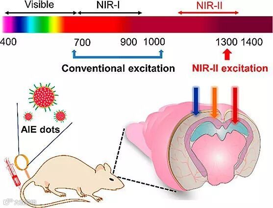 最近,香港科技大学的唐本忠院士和浙江大学的钱骏教授合作,首次报道了聚集诱导发光(AIE)材料用于1300 nm近红外II区激发和近红外I区发射的活体双光子成像,在老鼠脑部的成像深度超过1000 μm。在前期的研究工作中,唐本忠院士团队实现了基于AIE材料的近红外光声成像(ACS Nano, 2017, 11, 7177)、近红外II区荧光成像(Adv. Mater., 2018, 30, 1706856)以及荧光-光声双模式可控成像及治疗(Nat. Commun., 2018, 9, 1848)等。与普通的荧光成像相比,双光子荧光成像模式具有自身的一些独特优点,包括激发光能量低、光损伤小、组织穿透能力强、成像分辨率高等。传统双光子成像的激发波段主要位于680-1040 nm的波长范围,发射光谱则主要位于700 nm以下的可见光波段,因此其穿透深度只有几百微米(图1)。研究结果表明,1300 nm和1700 nm这两个波长的光具有最小的激发衰减性质,可以实现更好的穿透深度和成像效果。然而,传统有机染料面临“聚集导致荧光淬灭”(ACQ)等问题,尤其是共轭性比较大的近红外分子更会面临这一问题,使长波长激发的双光子成像变得非常困难。