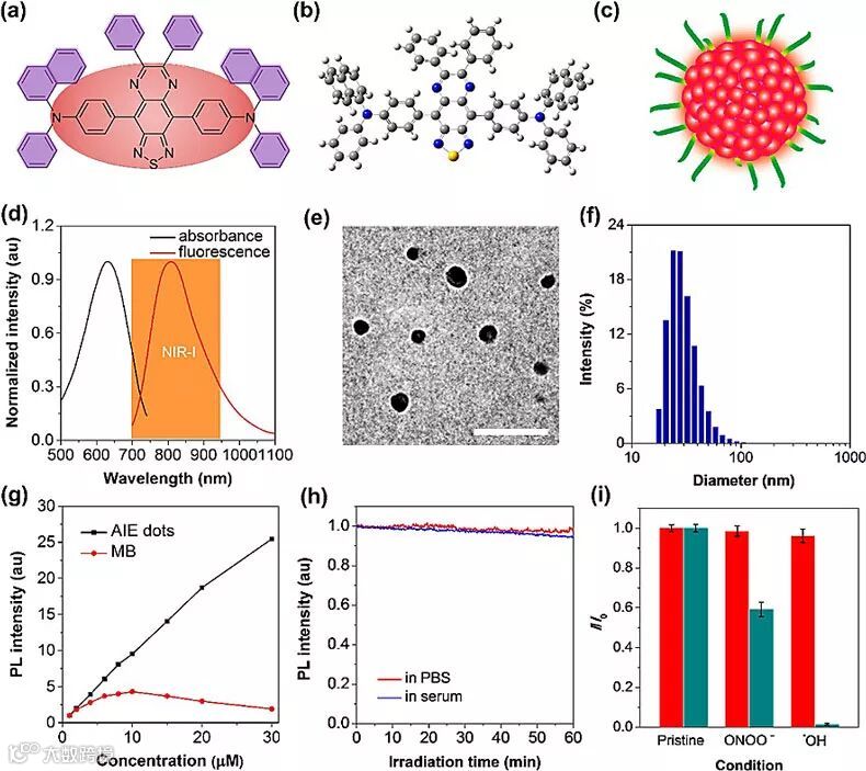 为了解决以上问题,作者设计并合成了“螃蟹”形状的给-受体(D-A)型AIE分子(图2)。该分子的中间部分是具有很强D-A作用的平面结构,有利于实现大的双光子吸收截面。分子上含有多个可以自由转动的分子转子,可以有效地克服ACQ问题,并实现AIE特性,得到高荧光量子产率。作者将该AIE分子包覆成尺寸约为35 nm的纳米粒子,其最大吸收位于635 nm,发射波长则可以覆盖700-1200 nm的范围。该AIE纳米粒子具有很好的稳定性,其抗光漂白和抗活性氧氮(RONS)的能力好于FDA认证的吲哚菁绿(ICG)染料。