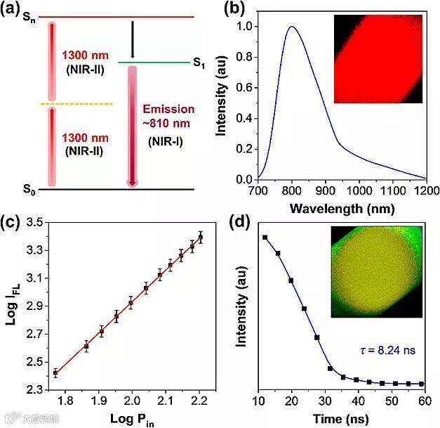 荧光成像具有高灵敏度、实时可控和设备简单等优点。目前,阻碍荧光成像大规模临床应用的问题是穿透深度比较浅。实现荧光成像深度的突破对该技术的临床转化具有非常重要的意义。与可见光区(400-700 nm)和传统的近红外I区(700-950 nm)相比,近红外II区(1000-1700 nm)具有更弱的组织吸收、散射、发射和自发荧光,因此有利于提高组织的穿透能力。近年来,近红外I区激发和近红外II区发射的成像模式受到了广泛的关注。另一种相反的成像策略,即近红外II激发、近红外I发射尚无报道。利用长波长近红外光(如1300 nm)的极强穿透能力,人们可以有效地降低生物组织和光的相互作用,实现深层的高分辨率成像。