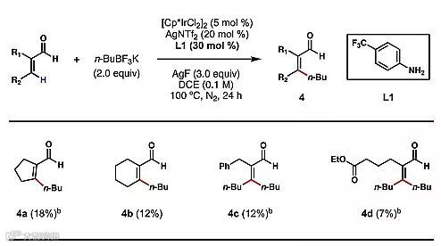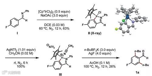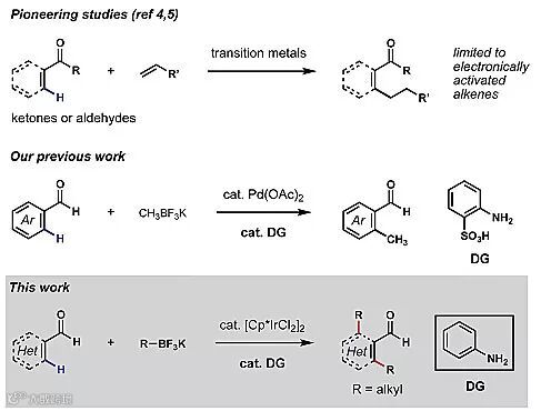 Xiao-Yang Chen和Erik J. Sorensen团队使用烷基三氟硼酸钾作为烷基化试剂,发展了Ir(III)催化(杂)芳香醛的邻位C(sp2)-H键烷基化反应,并初步尝试了α,β-不饱和醛的β-C-H键烷基化。反应中[Cp*IrCl2]2作为催化剂,与苯胺结合后可促进C(sp3)–C(sp2)键的还原消除,并抑制了β-H消除的过程,可用于高效制备单烷基化和双烷基化产物,该反应为含有芳香醛结构分子的C(sp2)-H键烷基化后期修饰提供了一种很好的方法。