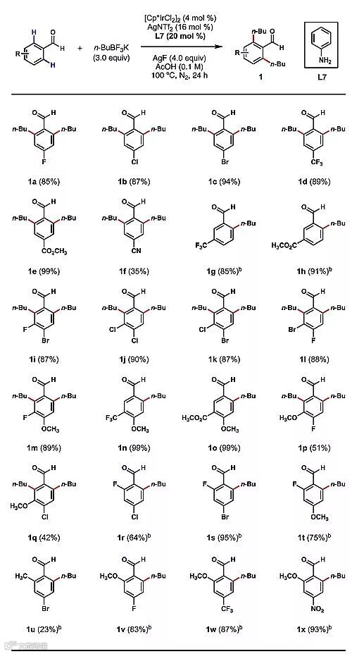 作者以4-溴苯甲醛作为模板底物,过量的n-BuBF3K作为烷基化试剂,在[Cp*IrCl2]2存在的条件下,考察一系列银盐添加剂、氧化剂、苯胺类配体、溶剂对反应结果的影响,最终得到最佳的反应条件:4 mol%的[Cp*IrCl2]2作为催化剂、16 mol%的AgNTf2作为Cl-捕获试剂、20 mol%的苯胺作为配体、3当量的n-BuBF3K作为烷基化试剂、4当量的AgF作为氧化剂、AcOH作为溶剂,反应在100 ℃下氮气保护进行24 h,最终以几近定量的产率得到邻位双烷基化产物。在最佳反应条件下,作者对底物的适用范围进行了考察,主要探究醛基邻位两个位置以外其它位置的取代基对反应结果的影响,取代基的位置不同,可以选择性得到单取代或二取代产物,单烷基化优先发生在位阻小的位置。不管是单烷基化还是双烷基化产物,产率都能达到良好到优秀的水平(图2)。