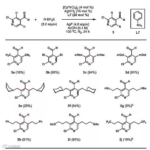作者接着固定2-氯4-吡啶甲醛作为模板底物,考察烷基三氟硼酸钾的适用性,从结果可以看出,使用不同的烷基化试剂,产物产率相差较为明显(图4)。