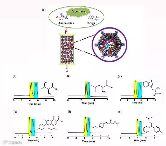 此外,为了研究生物分子的结构复杂性对其手性拆分性能的影响,他们分别研究了Lysozyme⊂COF 1、Peptide⊂COF 1、Lysine⊂COF 1作为手性固定相的拆分性能。表面增强拉曼散射光谱测试结果显示,生物分子的结构复杂性、手性中心的数量及其双亲性都可以影响生物分子的拆分性能。其中,Lysozyme⊂COF 1手性固定相具有最优的手性分离效果,可用于正相和反相等多种分离模式,可分离氨基酸、药物等多种手性底物(图2),并且具有优良的重复利用性和再现性。这一研究为发展高效、耐用型的手性固定相及拓宽共价有机框架材料在手性分离、手性催化方面的应用提供了巨大的潜力。相关研究成果发表在Angew. Chem. Int. Ed.上。该研究工作得到自然科学基金、南开大学以及药物化学生物学国家重点实验室的资助。