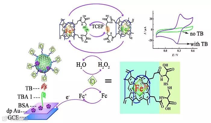 该研究设计了基于L-Cys-hemin/G-四分体自催化的新型电化学放大策略,相比于传统的hemin/G-四分体,其表面具有自组装双层L-Cys的L-Cys-hemin/G-四分体自催化复合物,使亲和力显著提高。该策略消除了底物L-Cys的扩散动力学效应,加速了底物中间体的转移时间,并有效防止扩散过程中间体的损失,实现了对目标物低至皮摩尔的检测。