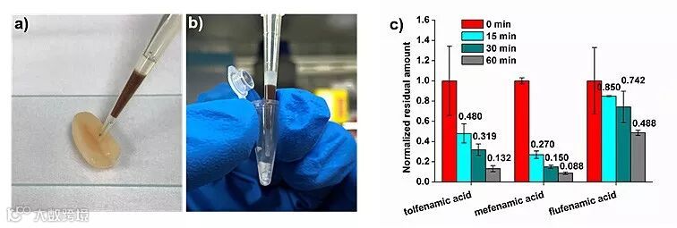 图2. 移液枪头微萃取装置从(a)花生表面及(b)花生粉末中回收溶剂萃取的黄曲霉素B1抗体溶液;(c)细胞色素C催化药物降解的反应动力学过程。