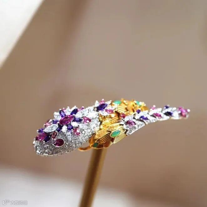 50年代,BVLGARI的蛇形开始更为具体,珍贵的蛇头点缀着红宝石、祖母绿或钻石蛇眼