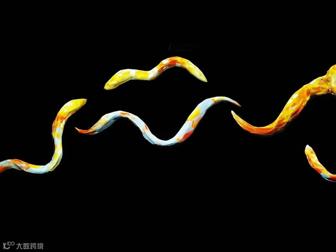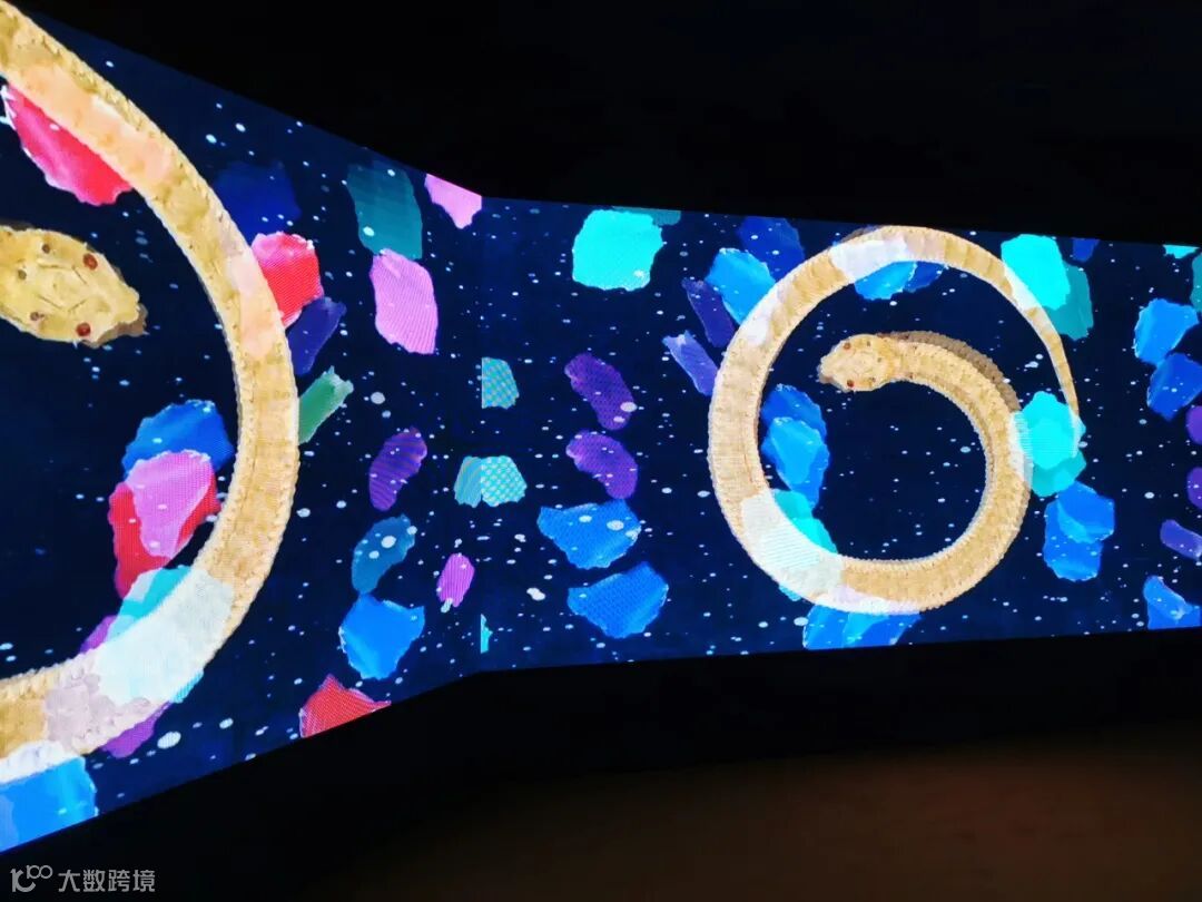 刘佳玉影像装置作品《灵光鎏影》中,墙面的蛇形雕塑既是静止的图腾与符号,也会随着动态图像的投影处在层层蜕变中,五彩斑斓的小蛇随着光影活泼泼的变化各种造型,与开场的艺术家吴俊勇《光的种子》有一种互文的关系。