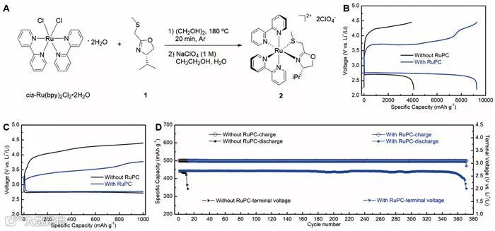 图1.(A)RuPC的合成路线;(B)200 mA g-1电流密度下,含RuPC和不含RuPC的Li-O2电池的全充放曲线;(C)在100 mA g-1电流密度下,控制放电容量为1000 mAh g-1时,含RuPC和不含RuPC的Li-O2电池的充放电曲线;(D)在400 mA g-1电流密度下,控制放电容量为500 mAh g-1时,含RuPC和不含RuPC的Li-O2电池的循环性能和对应的放电终止电压。图片来源:Chem