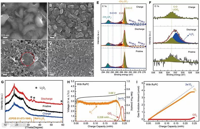 图2. 不含RuPC(A)和含RuPC(B)的Li-O2电池放电后的电极形貌;不含RuPC(C)和含RuPC(D)的Li-O2电池充电后的电极形貌;含RuPC的Li-O2电池正极的初始、放电和充电态的C 1s(E)和O1s(F)XPS谱图;(G)含RuPC的Li-O2电池正极的初始、放电和充电态的XRD谱图;(H)含RuPC的Li-O2电池的恒电流充电曲线和相应的气体析出速率曲线;(I)含RuPC的Li-O2电池在充电过程某一充电态下析出的气体量。图片来源:Chem