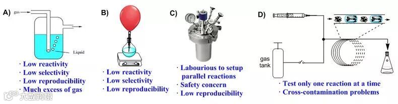 图1. 已知气液双相反应的操作方法:(A)气体鼓泡,(B)气球,(C)高压反应釜,(D)连续流动反应装置。