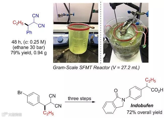 吴杰博士课题组最近发现,在可见光的诱导下,反应使用Mes-Arc+ClO4-作为光催化剂,5 mol% HCl作为氢转移(hydrogen atom transfer, HAT)催化剂,在SFMT管路内可以实现乙烷与缺电子烯烃的乙基化反应(Angew. Chem. Int. Ed., 2018, DOI: 10.1002/anie.201804844)。乙烷的C-H键键能为101.1 kcal/mol,属于非常不活泼的C-H键。Mes-Arc+ClO4-被可见光激发以后成为强氧化剂(E1/2(cat*/cat•) = +2.06 V vs SCE),可以将Cl-氧化成氯自由基(Eox(Cl-/Cl•) = +2.03 V vs SCE)。而氯自由基可以和乙烷发生HAT,形成乙基自由基和HCl。此时乙基自由基可以加成到缺电子烯烃,形成新的碳自由基。新形成的碳自由基可以将Mes-Arc•氧化再生Mes-Arc+,从而实现催化循环。该反应适用于各种取代的强缺电子烯烃,得到很高收率的乙基化产物(图5)。该反应实现了在无金属参与的条件下利用乙烷作为乙烯基试剂。反应和SFMT反应器非常匹配。传统反应装置很难实现在高压、光照条件下乙烷的转化。另外,HCl也非常容易挥发,而传统反应装置无法保证其一直处于溶液环境中。此反应所需时间比较长(24-48小时),所以也不适合连续流动合成反应器。而通过对SFMT反应器管路的放大,人们可以实现克量级规模产物的合成(图6)。形成的乙基化产物在药物合成中非常有用,比如其中一个产物通过三步高产率的转化,可以得到血小板聚集阻碍剂indobufen。