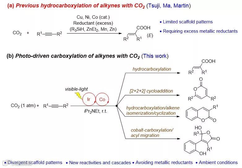 二氧化碳是一种无毒、廉价易得并且储量丰富的可再生C1资源。过渡金属催化炔烃与二氧化碳的氢羧化和碳羧化的方法合成高附加值化合物是该领域研究的热点之一(图4a)。尽管该类转化已经得到广泛的研究,但是可得到的产物类型单一,主要局限于丙烯酸类和2-吡喃酮类化合物。已发展的催化体系需要金属还原试剂,如二乙基锌、硅烷、锰粉和锌粉。