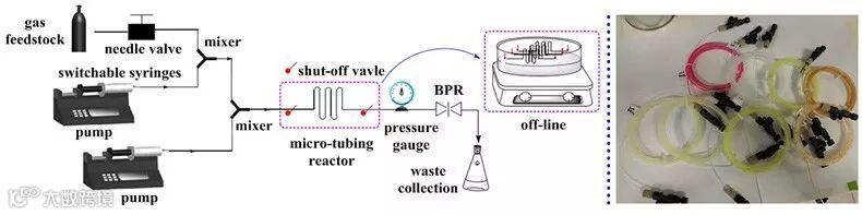 利用天然气体原料合成高附加值的化学产品具有非常吸引人的环保和经济价值。高压条件使反应可以在高于试剂或溶剂的常压沸点下进行,从而提高反应速率。气体的溶解度由亨利定律的分压控制,高压对于涉及气体试剂的反应格外重要,能大大提高在其反应溶剂中的溶解度。然而目前常用的高压反应器价格昂贵,操作比较复杂,不适用于光催化反应,并且存在潜在的安全隐患。由于实验室传统条件没有高效安全而又操作简易的反应装置能够满足在光照条件下利用气体进行合成反应,使得该研究领域大大受限。而吴博士课题组最近开发的“停流”封闭式微型管路反应器(SFMT)可以很好地保持高压的实验环境。该反应器非常适用于高压下利用气体在光照条件下进行反应的研究,填补了这一空白。