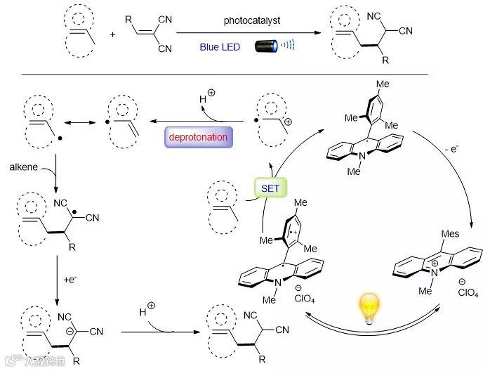 该课题组采用一种有机分子[Acr+-Mes]ClO4作为光敏剂,实现了可见光诱导条件下烯丙基及苄基C(sp3)-H键的高效烷基化。反应仅需要5 mol%或1.25 mol%的有机光敏剂,以蓝色LED灯为光源(λmax = 475 nm),在常温条件下实现了原子经济性的高效转化。该反应具有极广的底物适用范围,四取代、三取代及二取代的脂肪链式或环状烯烃都表现出较好的反应性,能与不同结构的双氰基烯烃、双羰基烯烃以及1,1-双氰基-1,3-二烯烃反应,以良好及优秀的收率得到相应的烯丙基化产物(图7)。此外,该反应中C(sp3)-H键底物还可以拓展至苄基芳香烃,不管是富电子芳香烃还是缺电子芳香烃,都能选择性实现苄位C(sp3)-H键的直接烷基化。在机理探索方面,他们通过一系列条件控制实验、荧光淬灭实验以及量子化学计算,充分证明了反应经过烯基或芳基自由基正离子去质子的关键步骤,所形成的烯丙基或苄基自由基是反应得以顺利进行的关键中间体(图8)。利用连续流动反应器,该反应能在更短的反应时间内实现克量级规模的合成。该反应首次实现了可见光促进下无金属参与的惰性烯丙基及苄基C(sp3)-H键的高效烷基化,具有重要的合成应用价值(Chem. Sci., 2017, 8, 4654)。