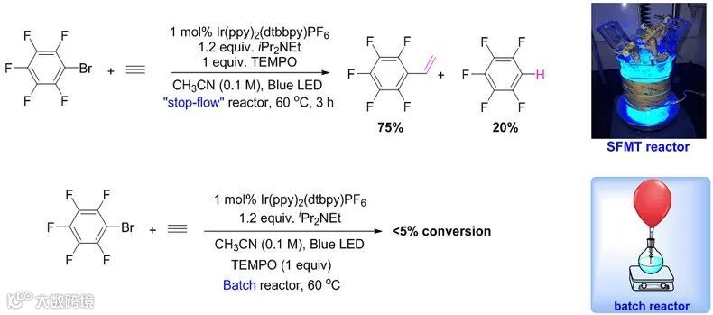 在SFMT系统的帮助下,吴杰博士课题组发展了第一个在光催化条件下直接使用乙炔气体对芳基卤代物进行乙烯基化的反应(图3, Chem. Sci., 2017, 8, 3623)。在传统反应器中加热的条件下,乙炔在反应溶剂中溶解度低,易挥发到溶液以外无法获得目标产物。SFMT反应器则很好地将乙炔封在反应管内,以良好的收率得到目标产物。通过对比,SFMT反应器实现了在常规反应器里无法实现的反应,体现了SFMT反应器在利用气体进行光照反应的优势。