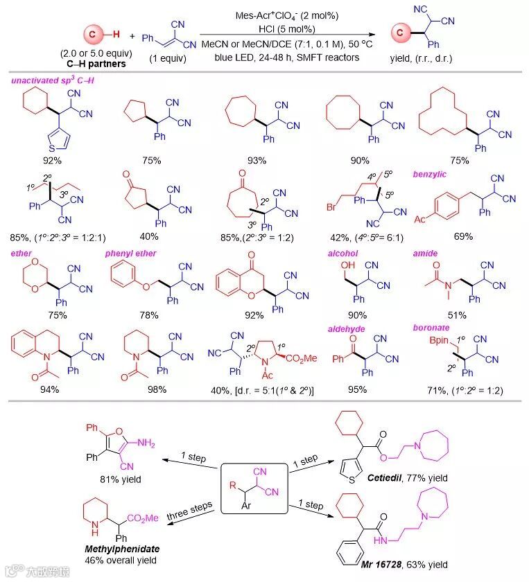 最近,该课题组发现,当反应以5 mol% HCl作为间接氢转移催化剂,2 mol%的Mes-Arc+ClO4-作为光催化剂,在SFMT管道内可以实现无金属参与不活泼C(sp3)-H键与缺电子烯烃的加成反应(Angew. Chem. Int. Ed., 2018, 57, 12661)。该方法的底物适用范围非常广,可以应用于普通的烷烃、醚、脂肪族酰胺、醇、醛、缺电子的苄基以及硼酸酯等底物直接的C(sp3)-H键烷基化反应。通过最多三步过程,该反应的反应产物可以转化为具有生物活性的药物中间体、药物活性分子及其衍生物(图11)。