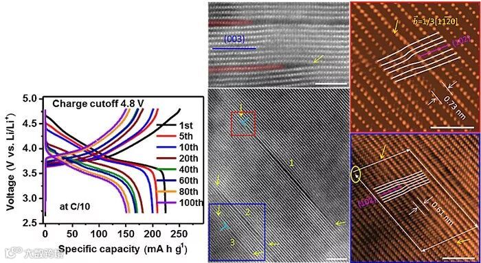 图1. LiNi0.6Mn0.2Co0.2O2的循环性能和循环后产生的晶内裂纹。右图展示了裂纹与刃型位错相连的高分辨成像。
