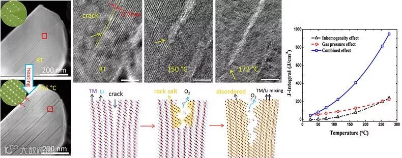 为了研究裂纹产生的机制,该团队通过原位加热的实验成功诱导了裂纹的产生,并进行了透射电镜的观察记录。如图2所示,左图展示了加热前后裂纹数量增长的对比图,中间图片展示了裂纹扩展的原子机制,右图展示了有限元模拟的结果,证实了耦合效应大于单个效应的线性叠加。