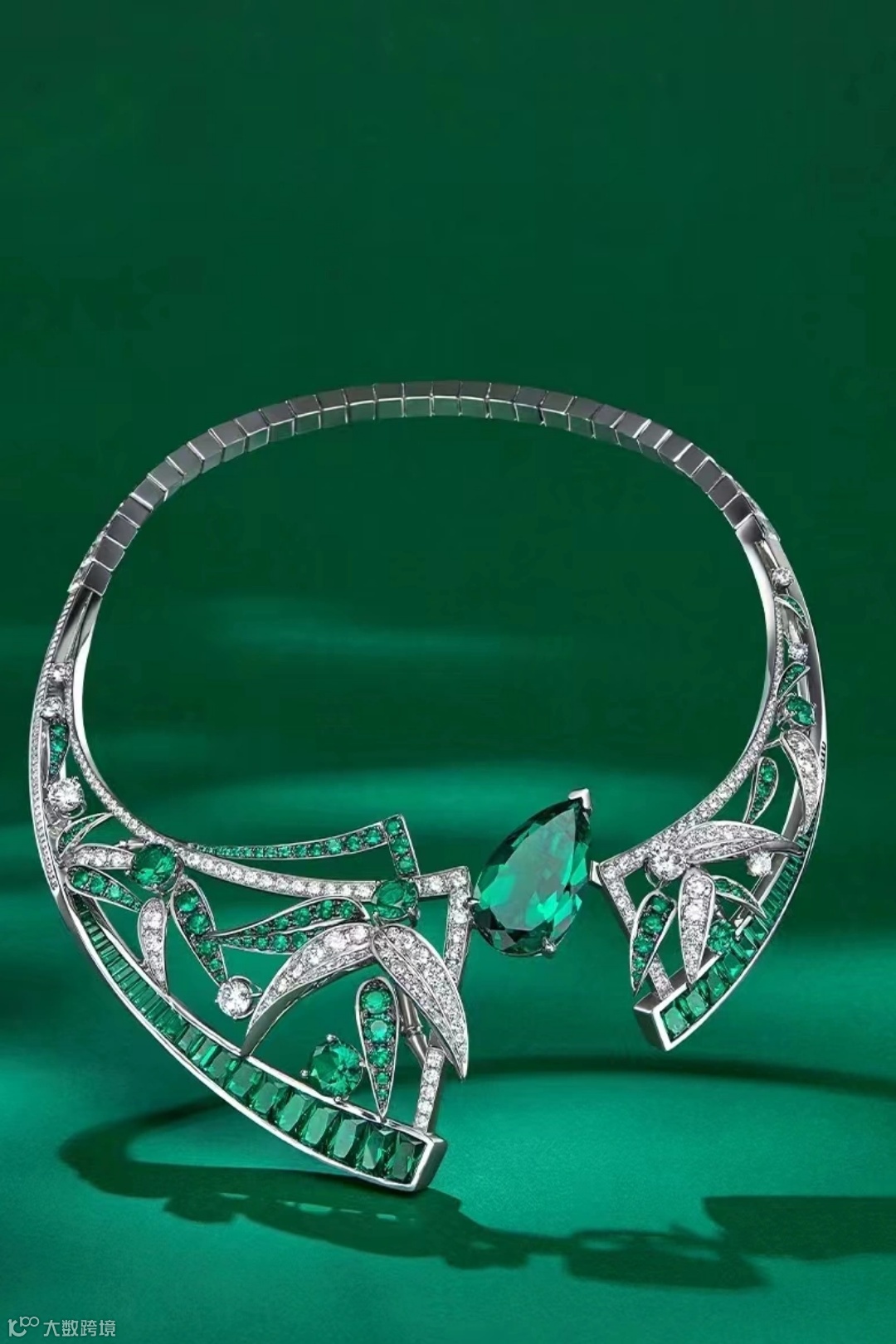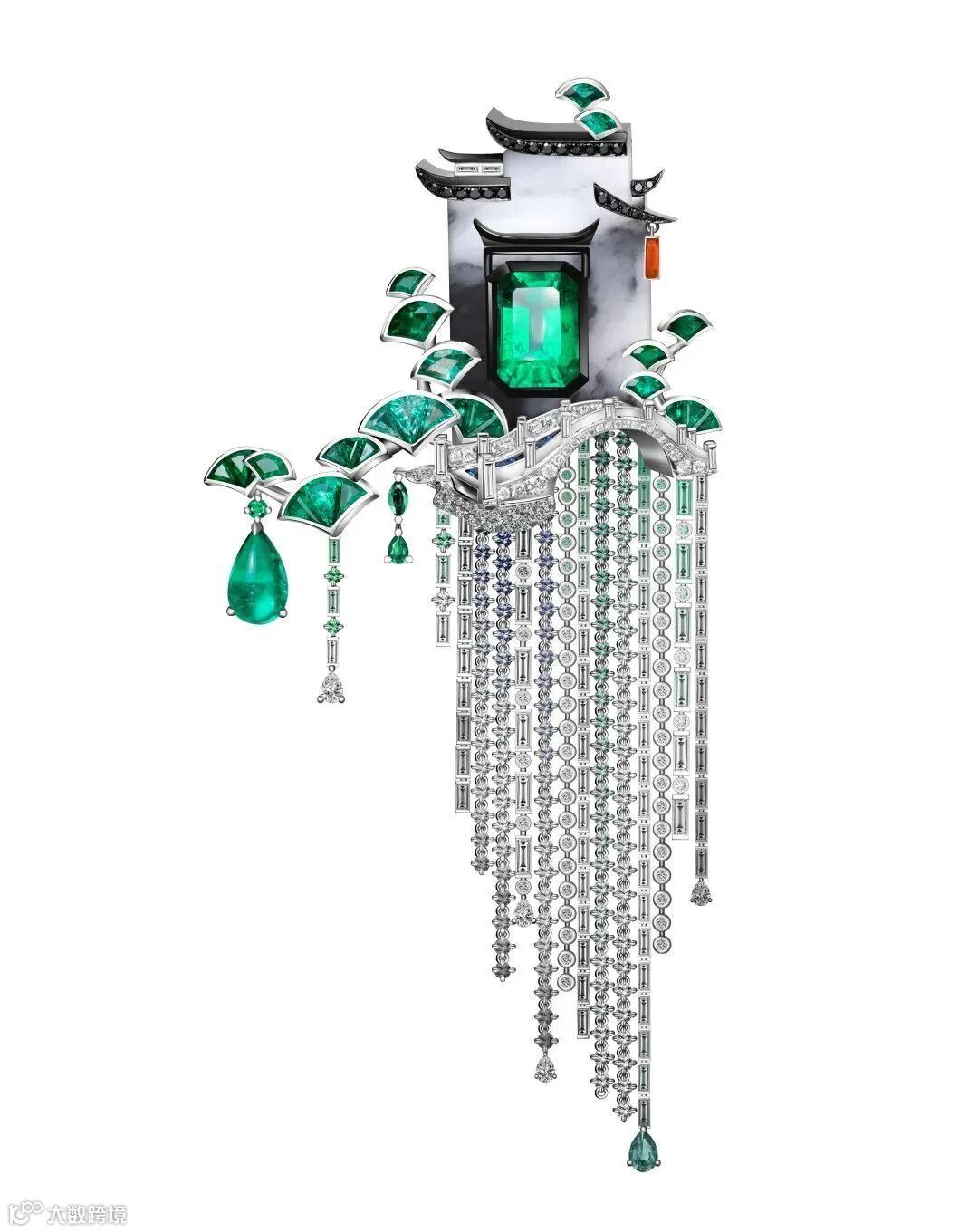 裴潇雨运用了和田玉里的青花料进行设计,将颇受中国人喜爱的和田玉材质与更受西方人推崇的祖母绿完美结合,青花料如天然水墨晕染的色泽巧妙还原了江南水乡风雨浸染过的墙面质地,祖母绿的深幽则突出了迎客松的苍翠,营造出唯美、诗意的江南意境。