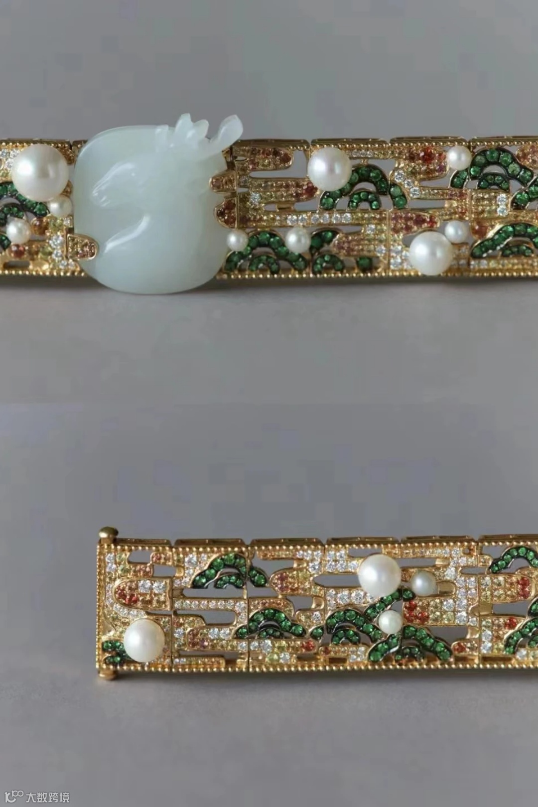 在设计之初,我试着用东方的国玉和西方彩色宝石的组合来讲述敦煌故事,将九色鹿这一主题设计成为一件可佩戴的现代艺术珠宝,主石用和田玉雕刻出浮雕感的鹿头,橙色蓝宝石、黄色蓝宝石、钻石的渐变镶嵌表现壁画中暖色系弯延的金色长河,绵延起伏的山峦用祖母绿镶嵌,akoya珍珠点缀其间为日月星辰。