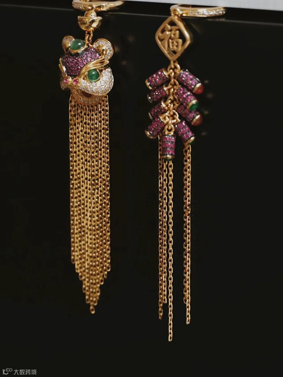 这是无二的设计师张琳为长沙去兰州旅游的一对小情侣,定制的一对AB款醒狮耳环,耳坠、吊坠两用。材质:18 K黄金红宝石、钻石、绿翡。