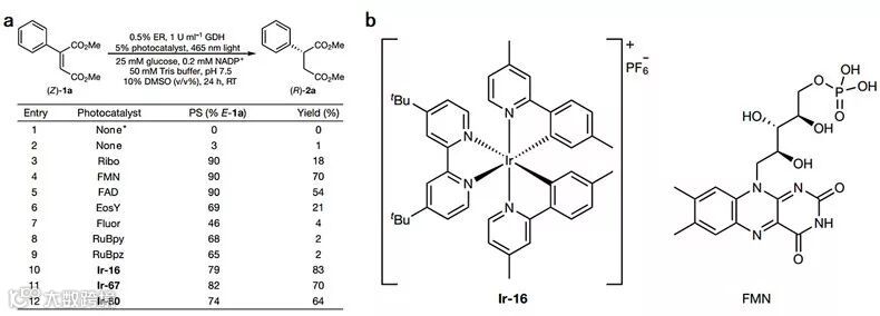 光催化反应通常可以在室温或接近室温的条件下发生,这就为与酶催化向结合提供了可能。除此之外,光催化反应还可通过电子及能量转移过程产生在水体系中稳定并且可与酶分子中官能团兼容的中间体,从而促进后续反应进行。为了研究化学催化与酶催化结合的效果,作者以2-苯基-丁-2-烯二酸二甲酯(1a)作为模板底物进行考察。YersER是一种从伯氏耶尔森菌分离出来的烯还原酶(ene-reductase, ER),当反应体系中存在葡萄糖脱氢酶进行辅因子再生时,它能以高产率和高对映选择性还原(E)-1a为2a。由于这种烯还原酶无法还原(Z)-1a,就需要找到一种能催化烯烃异构化的催化剂,同时还得与烯还原酶兼容。由于(Z)-1a在室温条件下只有极少量发生热异构化,而近期报道的一些光催化剂可以在室温或接近室温的条件下催化烯烃异构化,因此作者认为可以将烯烃的光催化异构化与酶促还原反应相结合,发展一种新型的化学-酶协同反应。