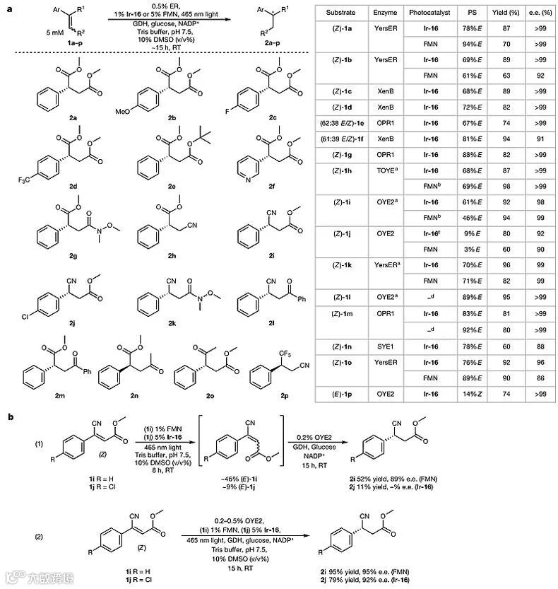 图3. 不同光催化剂下(Z)-1a同时进行光催化异构化和酶促还原反应。图片来源:Nature