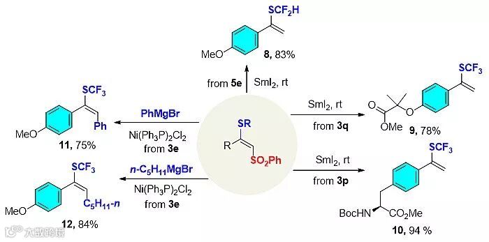 研究人员还将所得产物进行官能团转化。利用SmI2作还原剂,在温和的条件下实现了烯基砜类化合物的脱砜反应;并且利用Ni催化剂,成功实现了烯基砜与格式试剂的偶联反应,合成了一系列全新的含SCF3、SCF2官能团的烯烃,该类烯烃用别的方法非常难以合成得到(图4)。