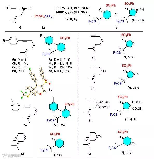 烯炔的串联环化反应是构筑碳环和杂环的重要合成方法,对于烯炔的原子转移加成反应还是非常少见的。为抑制可能存在的烯、炔反应活性的相互竞争问题,作者合成了具有较大位阻的异戊烯结构单元的1.6-烯炔和1.7-烯炔。如图3所示,反应均能高效发生,原子经济性地一步构建双硫化的环系结构:对于含有芳香取代基的内炔,砜自由基加成后生成更稳定的苄位自由基,串联环化得到环内烯烃杂环;对于端炔,砜自由基倾向加成于端位,进一步串联环化得到环外烯烃的环系产物。