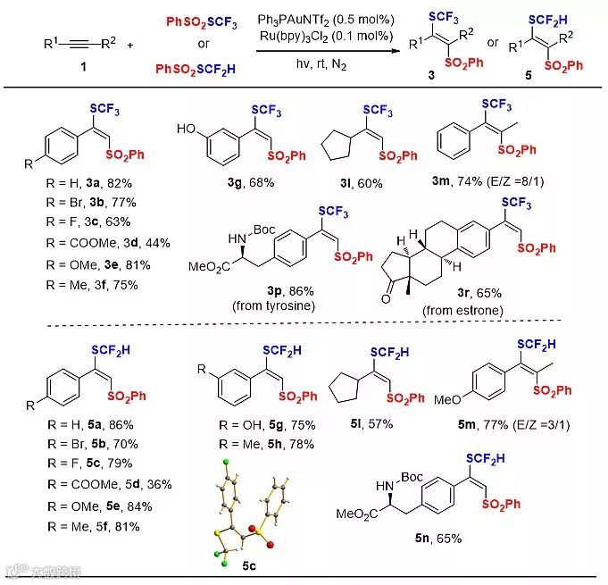 通过对反应条件的探究,研究人员发现,利用之前报道的PhSO2SR对烯烃加成的反应条件完全无法适用于对炔烃的加成,反应中金催化剂、光敏剂、溶剂都对反应影响很大;降低金催化剂的用量至0.5 mol%能够显著提升反应产率;和金同一族的铜和银催化剂都无法代替金催化剂。在最优的反应条件下,研究人员对反应的普适性进行了探索(图2)。反应可适用于各种各样的端炔、非端炔,并且反应对官能团的兼容性良好,如含酚羟基的炔烃、氨基酸和甾体衍生的炔烃都能够在该反应条件下进行,立体单一性的生成反式加成产物。该反应适用于硫三氟甲基化反应,同样适用于硫二氟甲基化反应,具有很好的普适应。