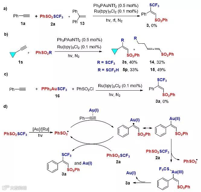 进一步的机理实验研究证明,反应中加入自由基捕获剂如二苯乙烯,反应完全被抑制,证实了反应的自由基历程;当使用环丙基乙炔的时候,除了得到正常的双功能化产物外,还得到了自由基钟产物联烯,证实反应经过了砜自由基对炔加成的步骤;作者测量了反应的量子产率为1.4,说明反应为自由基链式反应。基于此作者提出了如图5所示的反应机理:在金催化剂和光敏剂协同作用下产生PhSO2自由基对炔烃进行加成,产生的烯基自由基在金催化剂的作用下立体专一性地构筑新的碳硫键,并释放出PhSO2自由基参与反应的循环。反应有可能经理Au(I)-Au(III)的催化循环,确切的过程有待进一步的机理验证。